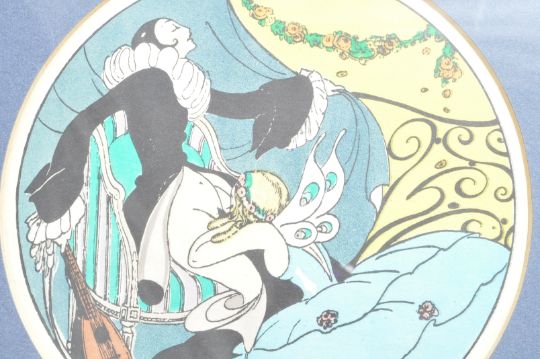 Gerda Wegener (Danish 1885-1940) - Delassements D'eros - An Art Deco pochoir on paper coloured circular plate / print depicting an erotic scene featuring a female musician and a fairy. The plate part of 12 others in the series with all being limited to 1500 with this edition being number 273. Framed and glazed. Artwork measures approx; 810mm diameter. Frame measures approx; 36cm x 33cm.