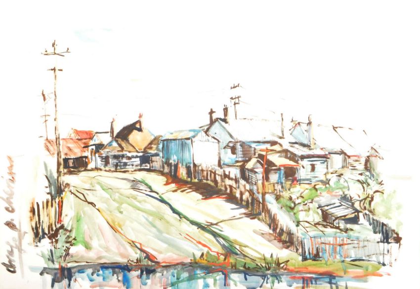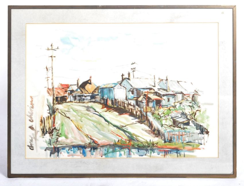 Believed Drago P. Chening - A mid 20th Century watercolour on paper painting of an Australian village scene with a river to the foreground and house to the background. Signed to the left by the artist. Set within a brass frame and being glazed. Painting measures approx; 500mm x 710mm. Frame measures approx; 64cm x 86cm.