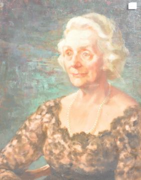 Miki Hood - An oil on canvas portrait painting of Mrs Jeannette Bulcock. The lady seated wearing and evening dressing with a single string pearl necklace with blue tones to the backdrop. Signed to the lower right and the verso of the canvas, dated 1976. Framed and glazed. painting measures approx; 490mm x 350mm. Frame measures approx; 63cm x 53cm.