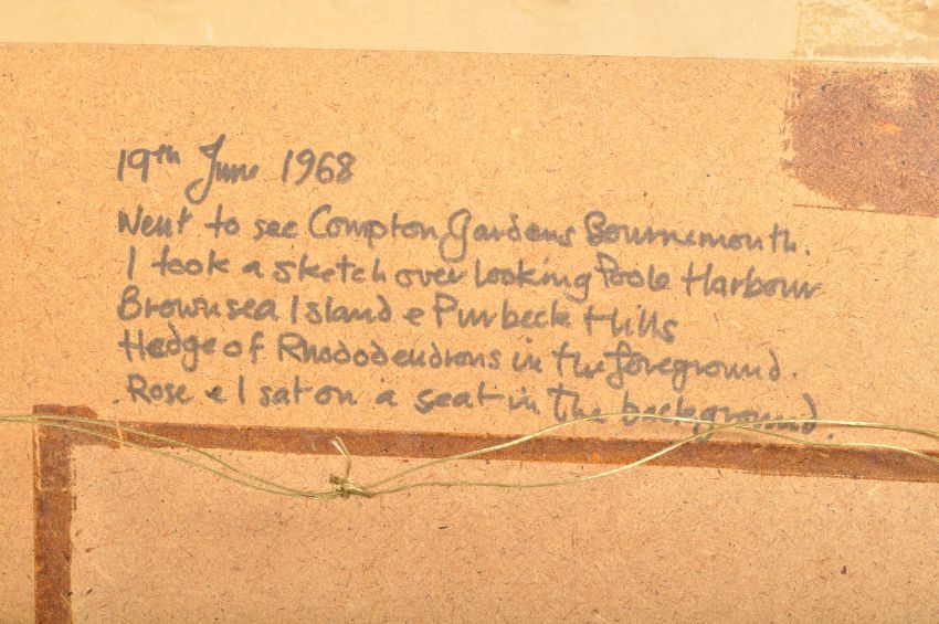 G. L. Dennis - A watercolour on paper landscape painting depicting Compton Gardens overlooking Poole Harbour with figures to the foreground and sailing boats to the backdrop. Signed by the artist to the lower right and dated 1968. Framed and glazed. Painting measures approx; 370mm x 530mm. Frame measures approx; 46cm x 62cm.