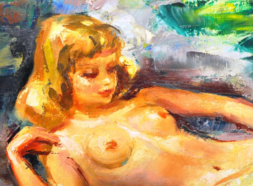 Robert Van Cleef (Paris Born 1914) - A mid 20th Century French oil on canvas painting study of young nude lady reclining having a delicately draped cloth across her. Signed by the artist in blue to the bottom left. Set within a decorative floral gilt carved frame. Painting measures approx; 220mm x 27mm. Frame measures approx; 37cm x 42cm.