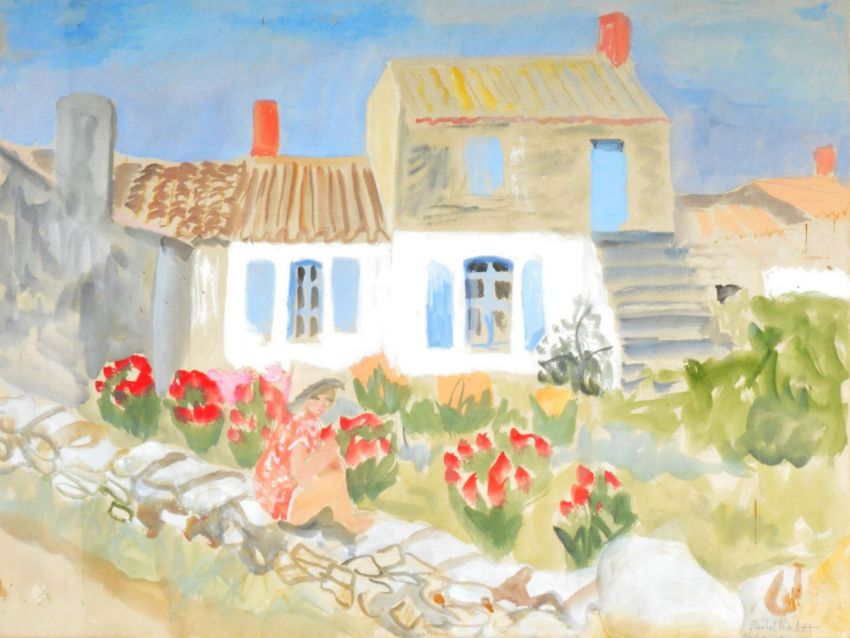 Rachel Reckitt (b. 1908-1995) - A watercolour on paper painting depicting charming cottage with a garden to the foreground decorated with tulips and stone wall. Signed to lower right. Framed and glazed. Painting measures approx; 610mm x 740mm. Frame measures approx; 70cm x 82cm.
