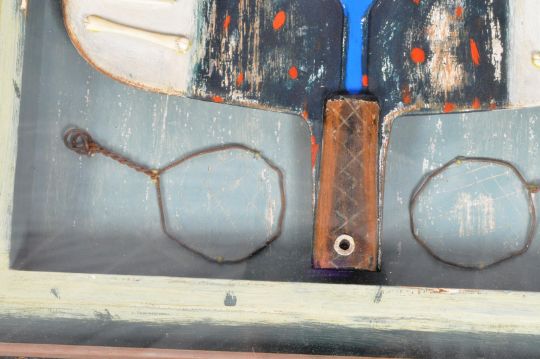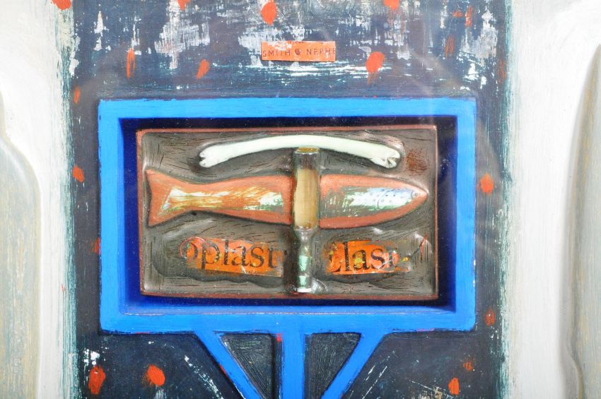 A framed and glazed 3D abstract wooden panel artwork sculpture having applied decoration with a central fish with with bones scattered throughout with various other applied objects. Unsigned. Set within a deep frame. Sculpture measures approx; 330mm x 330mm. Frame measures approx; 44cm x 48cm.