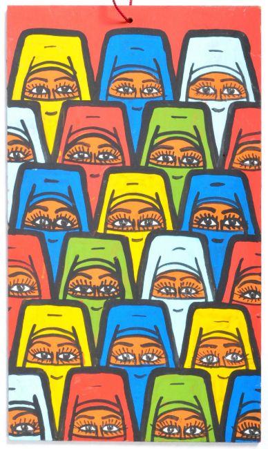 A middle Eastern oil on board painting depicting rows of ladies wearing Niqabs' of varying colours with all on red ground. Unsigned. Painting measures approx; 350mm x 200mm.