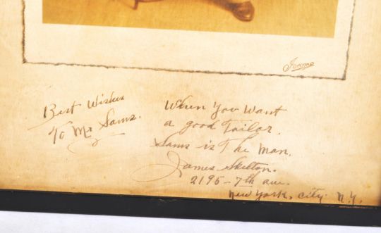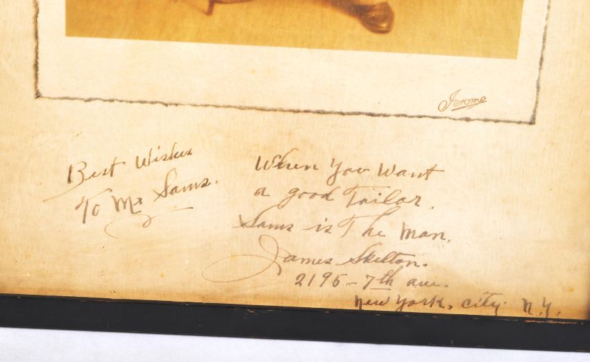 'Best Wishes Mrs Sams' - A framed and glazed photograph of gentleman holding his coat with a pipe in his mouth a cane in his hand. Notation below reading 'When You Want A Good Tailor Sams Is The Man'. Signed by Janus Skillton. As a gift for his wife. Photo measures approx; 250mm x 180mm. Leather back frame measures approx; 37cm x 27cm.