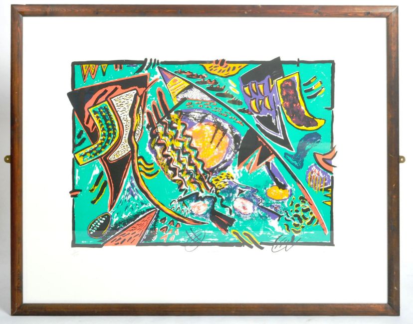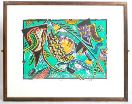 Renos Loizou (Greek 1948-2013) - Three Heads - A signed limited edition abstract screen print in colours entitled 'Three Heads'. Signed and titled in pencil by the artist and dated 1985. Limited edition 12/20. Framed and glazed. Print measures approx; 920mm x 1210mm. Frame measures approx; 102cm x 131cm.