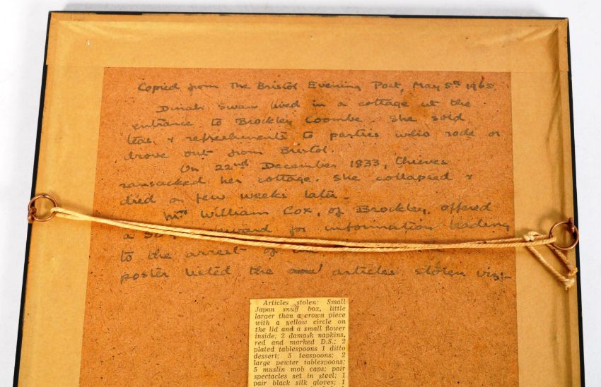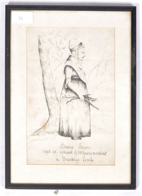 A pen and ink drawing sketch on silk linen depicting an old maiden collecting sticks with wording below reading ' Diana Swan aged 50, upward of 50 years resident in Brockley Combe '. Framed and glazed. Drawing measures approx; 240.50mm x 150.50mm. Frame measures approx; 33cm x 23.5cm. Unknown.