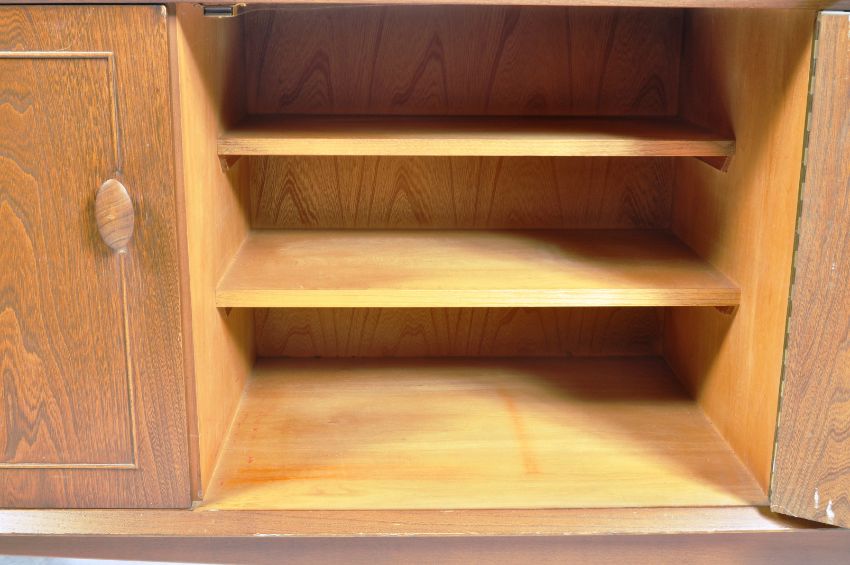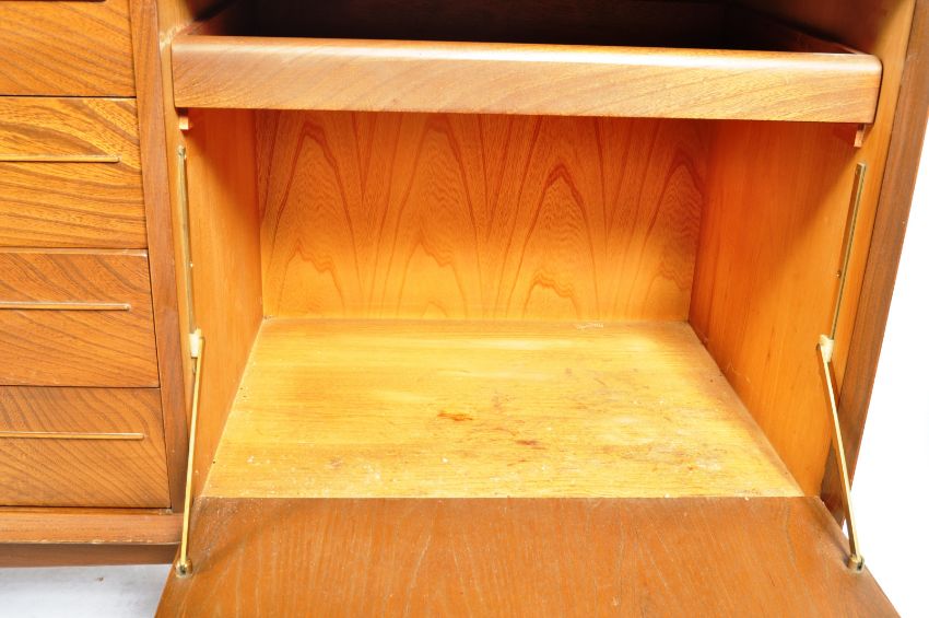 Wolfe & Hollander - Scandart - An original retro vintage mid 20th Century Scandinavian elm and teak wood sideboard credenza having a bank of four central drawers flanked by dual door cupboards to the left and full front cocktail drinks cupboard to the right. All raised on tapering supports. Condition; major wear mostly to the top, overall good. AF Measures approx; 73cm x 222cm x 46cm