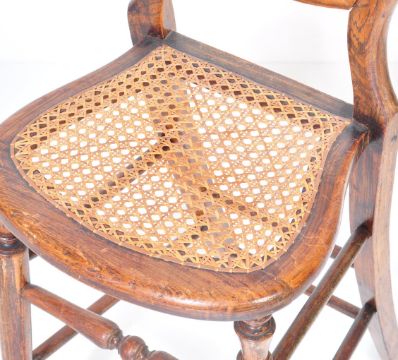 An early 20th Century Victorian child high chair. Having a carved balloon back rest, caned seat and raised on square legs united by stretchers.