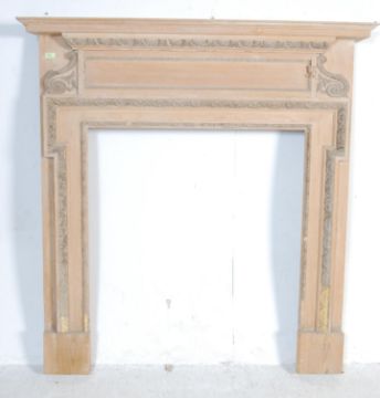 A 20th century antique style pine surround in the manner of Adams. The large fire surround having a pediment top with scrolled and foliate carved detailing around the border. Measures 140 x 134cm.