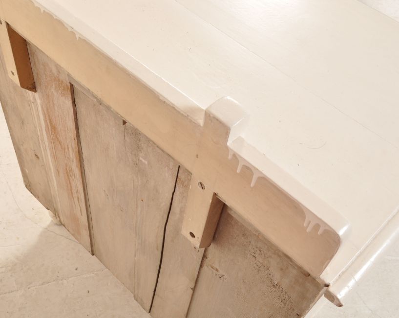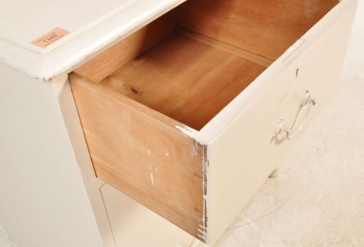 A Victorian 19th century white painted chest of drawers of a rectangular form with small gallery back and two over two drawers configuration with swing handles raised on turned legs. Measures 97cm x 83cm x 49cm