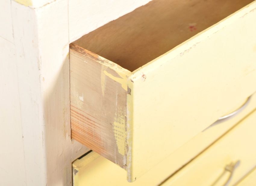 A vintage retro mid 20th century 1950s white painted pedestal chest of drawers. The chest of drawers of a tall rectangular form having five yellow painted drawers with arched handles raised on square legs. Measures, 77 cm H x 54 cm W x 41 cm D