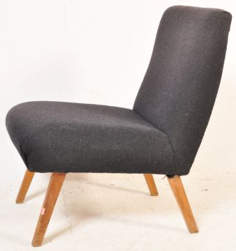 A  20th century circa 1980's  retro vintage bedroom chair having dark upholstery raised on tapered angular legs.