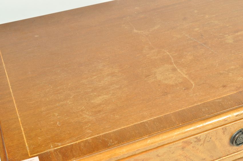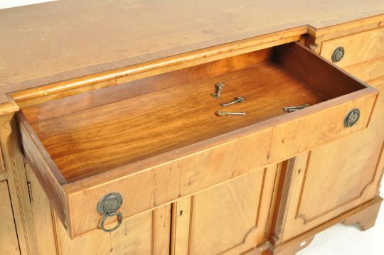 A 20th century Regency Revival mahogany inverted breakfront sideboard credenza / cupboard having shaped top over three drawers to the frieze above cupboards raised on bracket feet. Measures 91cm x 179cm x 46cm.