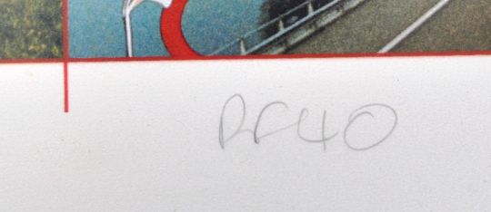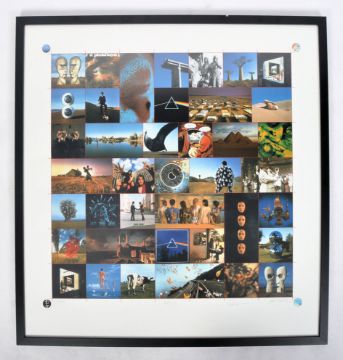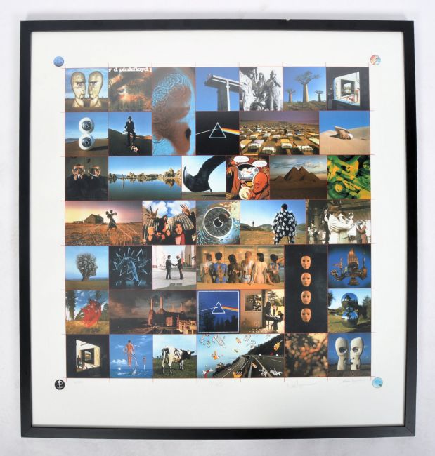 Storm Thorgerson (British, 1944-2013) - Pink Floyd's 40th anniversary in 2007 'PF40' - A large framed and glazed limited edition signed silk screen print in colours featuring album covers and images from Pink Floyd over their years together. Signed in pencil by Storm Thorgerson and the drummer from Pink Floyd Nick Mason to the lower right. In pencil limited edition number 10/160. Measures approx; 114cm x 110cm.