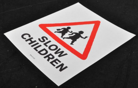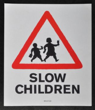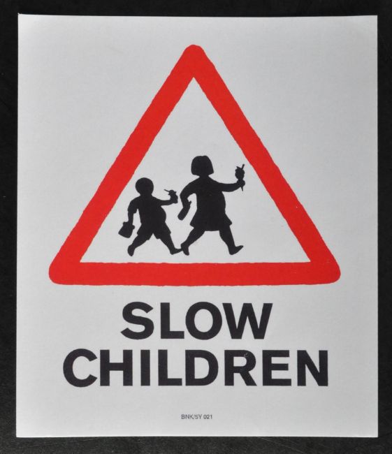 Banksy (British 1974-), ' Slow Children ', BNK/5Y 021. Starliner backed paste-up sticker in the form of a traditional sign, showing children with treats set within a red triangle. Text code to base. Obtained at the Oxfam Shop opposite the 'Banksy Vs Bristol Museum' Exhibition circa 2009. 12.5x10.5cm