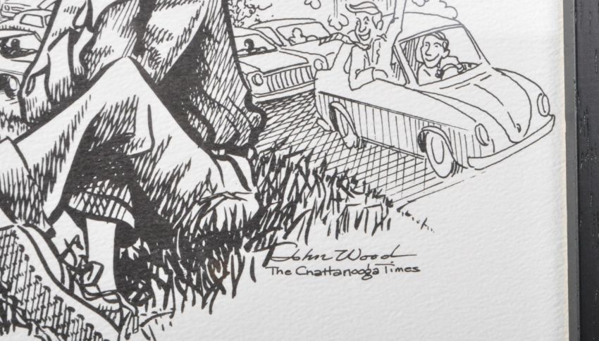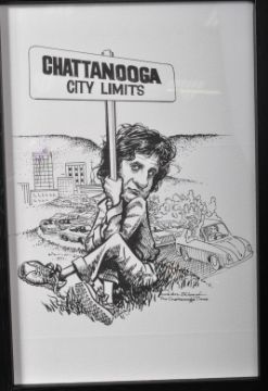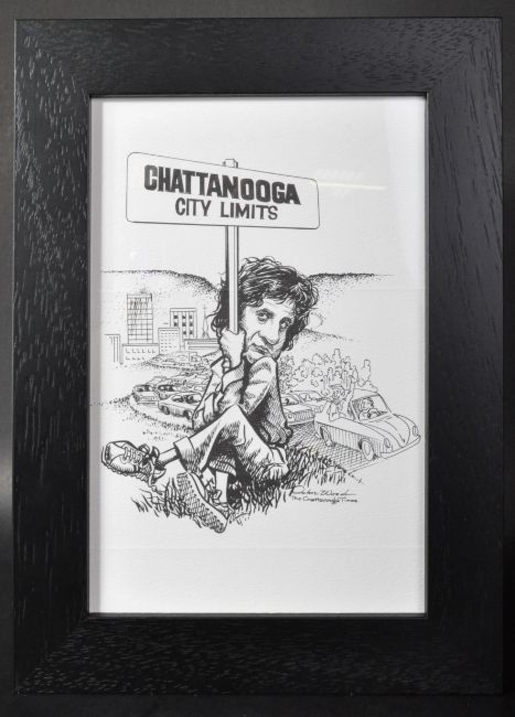 Johnny Cash (1932-2003 - American Singer / Songwriter) - a scarce original Christmas card from Cash's own collection. The card was sent out by Johnny and June in 1981 to close friends and acquaintances and features Cash holding onto a road sign ' Chattanooga City Limits '. The song, a comedic favourite was a highlight of the album The Baron, the card features a caricature of Cash to the outside as described in the song, and the text ' Best Wishes For The New Year ' to the interior. Artwork by John Wood. Framed. Total size: 33cm x 25cm