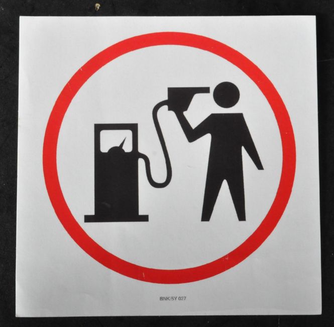 Banksy (British 1974-), ' Petrol Head ', BNK/5Y 027. Starliner backed paste-up sticker in the form of a traditional sign, showing a figure with petrol pump, surrounded with a red circle. Text code to base. Obtained at the Oxfam Shop opposite the 'Banksy Vs Bristol Museum' Exhibition circa 2009. 10.5x10.5cm