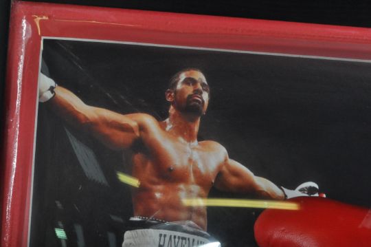 David Haye - Former Professional Boxer - signed Lonsdale boxing glove. Signed in black ink to the top, undedicated. Custom displayed in an acrylic bubble frame with various images of matches behind. Framed. With certificate. Measures approx; 51cm x 61cm.