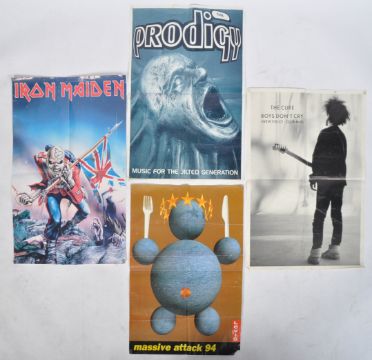 A collection of vintage music / band posters comprising Iron Maiden 2010 GB eye English poster, The Prodigy Music For The Jilted Generation 1994 German Empire Poster, The Cure Boys Don't Cry New Voice Club Mix EEC Poster and Massive Attack 94 Levis poster/ All folded with age related wear. Measures approx; 88cm x 63cm.