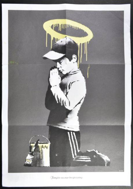 Banksy (British b. 1974) - 'Forgive Us Our Trespassing, 2010', offset coloured lithograph, a two-sided promotional poster for the 2010 documentary Exit Through the Gift Shop, 23.25" x 16.5". Folded, as issued.