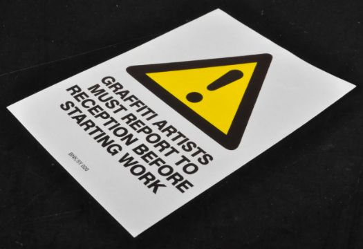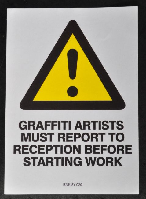 Banksy (British 1974-), ' Graffiti Artists Must Report To Reception Before Starting Work ', BNK/5Y 020. Starliner backed paste-up sticker in the form of a traditional warning sign with a yellow triangle motif. Obtained at the Oxfam Shop opposite the 'Banksy Vs Bristol Museum' Exhibition circa 2009. 10.5x15cm