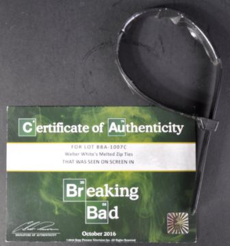 Breaking Bad - 2008-2013 American TV Series - a screen used prop zip tie, from the episode/s where Walter was tied to a radiator by Mike. With an official Sony issued Certificate Of Authenticity from their own Breaking Bad auction in 2016.