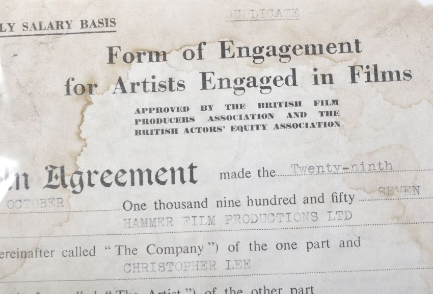 Sir Christopher Lee (1922-2015) - Hammer Horror - Dracula (1958) - Lee's original duplicate contract sheet for his appearance in the iconic movie, which propelled Lee to stardom in the Hammer franchise. The contract is dated 29th October 1957, and features typed text in the blank spaces. Lee performed the role for a guaranteed sum of £750. The contract has been framed, and appears in a fragile state. Total size approx; 38cm x 25cm. An important piece of cinema history.