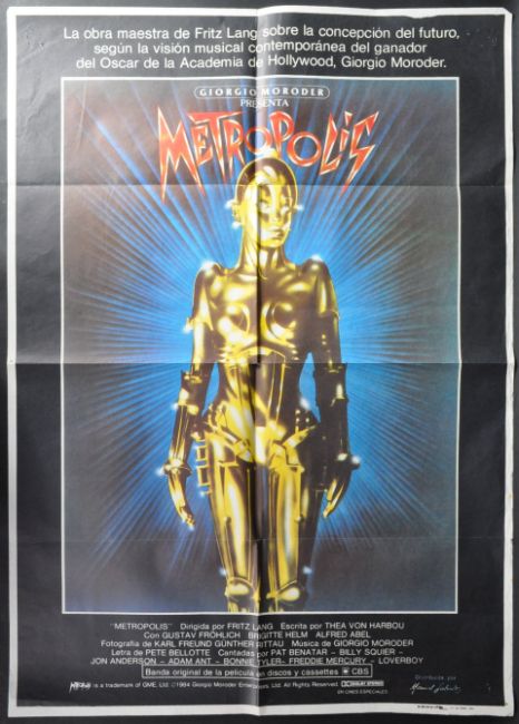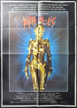 Metropolis (1927) - a 1984 re-release Spanish issue one sheet poster for the genre-defining film by Fritz Lang. Featuring classic artwork of the Maschinenmensch to centre. Credits to base, and title in classic form to top. Folded. Measures approx; 100x70cm