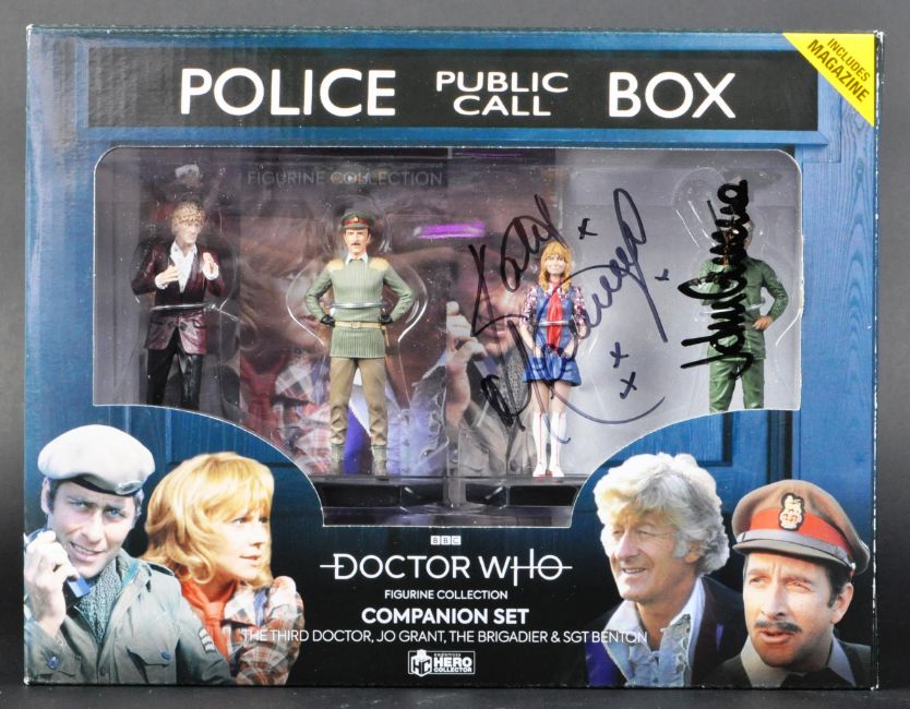 Doctor Who - Katy Manning (Jo Grant) and John Levene (Sergeant Benton) - autographed Eaglemoss ' Third Doctor Companion Set ' of action figures. Signed to the front by Manning and Levene in black ink, undedicated. Figure set unused, contents mint. Obtained in person, with certificate.