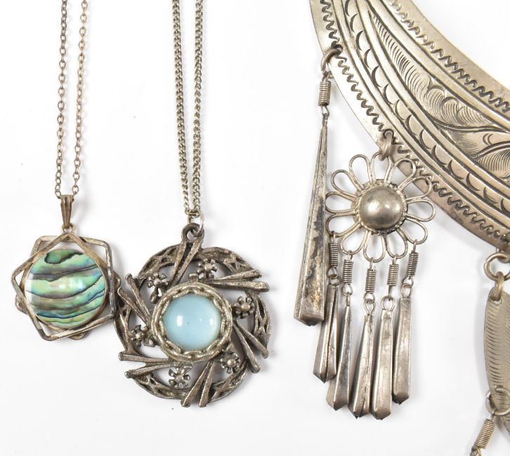 A collection of vintage jewellery to include a simulated amber necklace, a tribal silver white metal collar necklace, a cinnabar bangle bracelet, pendant necklaces, beaded necklaces, a silver white metal bangle bracelet set with agate stones and a carved bone necklace and bracelet.