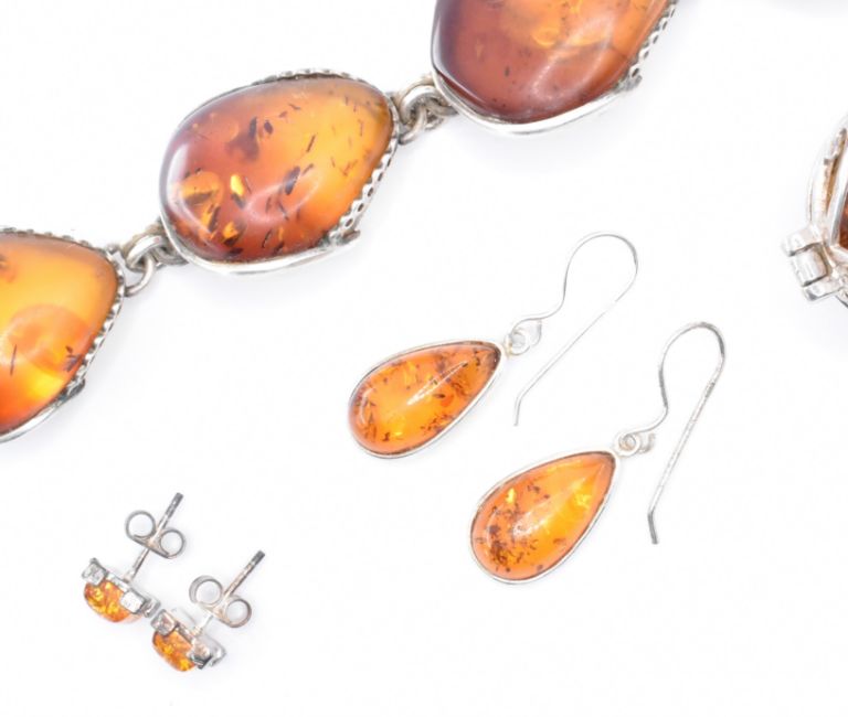 A collection of 925 silver and amber jewellery. The jewellery to include a bracelet marked 925 set with amber cabochons 19cms.  A  hallmarked silver pendant having a pierced cage with amber piece within - 6cm, a pair of amber drop earrings and a pair of amber stud earrings. Total weight 63g.