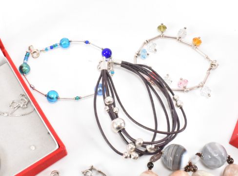 A selection of silver and other jewellery to include two Venetian glass pendant necklaces on silver chain, a multi chain necklace with cultured pearls, a silver ingot pendant necklace, a maltese cross pendant necklace, a multi strand leatherette bracelet with silver beads and clasp and a silver and glass bead bracelet. All marked as silver. Weight approx 51g. Lot also includes a gemstone necklace. Necklace measures 38 inches, shortest necklace measures 16 inches.