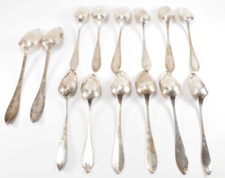 A group of fourteen German 800 silver spoons having pointed bowls and terminals, and engraved initials to the handles. Eleven marked 13, three marked 800. Various makers marks. Largest measures 27.5cm. Smallest measures 22cm. Weight 824g.