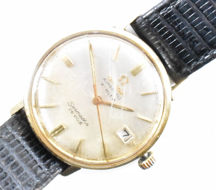 An Omega Seamaster Deville wrist watch. The case having a champagne dial signed Turler having date window at 3 o'clock. Face measures approx 3.6cms.
