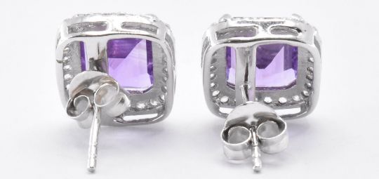 A pair of silver and amethyst stud earrings. The earrings being set with emerald cut amethysts with a halo of cz stones. Marked 295 to the posts. Amethysts measure 1.07 x 0.85 cm. Weight 4.1g.