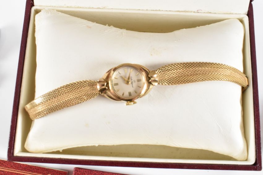 A collection of vintage costume jewellery to include a yellow metal Rotary wrist watch, a white metal enamelled sea horse brooch, a gold tone metal mesh bracelet with pearls and blue stones, a gold tone collar necklace, a Stratton compact, a Coral portable clock, a pair of silver and amber drop earrings and a floral bee brooch.