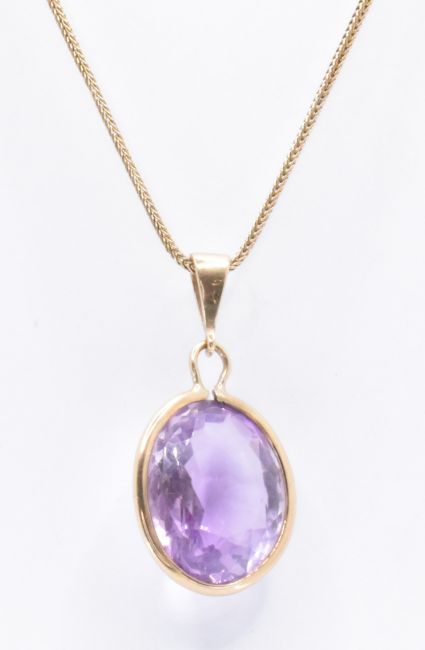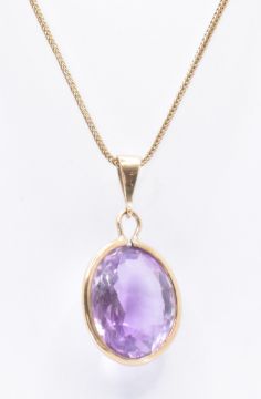 A 9ct gold and amethyst pendant necklace. The pendant set with a large oval cut amethyst on a snake link chain with a barrel shaped clasp. Bale marked 375, clasp marked 9ct. Amethyst measures 19.4 x 14.9 x 10.4mm. Weight 7.8g. Chain measures 16 inches.
