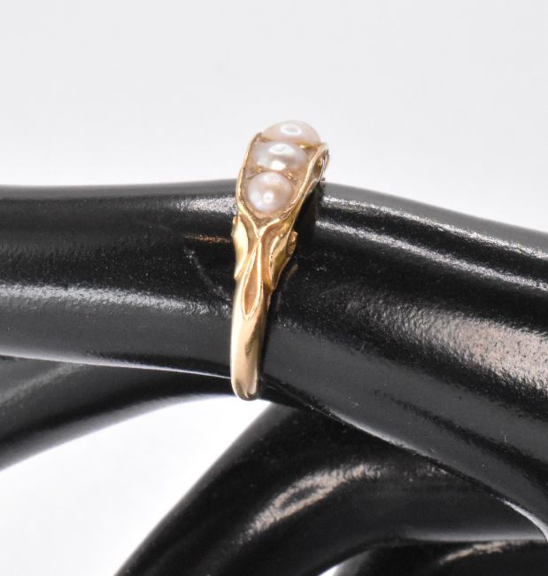 An 18ct gold and pearl half hoop ring. The ring set with five graduating pearls of varying colour to scroll decorate gallery to plain tapering shank. Weight 4.4g. Size M.