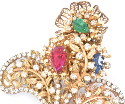 A 1960s vintage signed Amourelle Frank Hess floral spray brooch pin. The brooch having layered  filigree work set with realistic simulated  ruby,  emerald and sapphire jewels. Having a roller clasp fastener. Measures 3 1/2 inches.