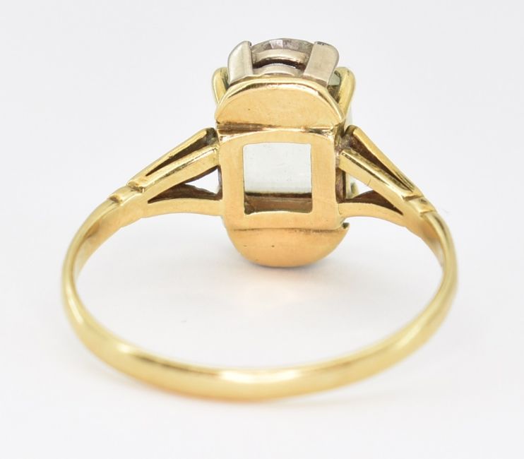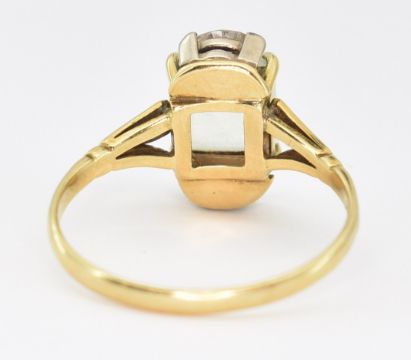 A hallmarked 18ct gold beryl and diamond cocktail ring. The ring set with an emerald cut yellow beryl flanked by to marquise cut diamonds to fleur de lys shoulders to plain shank. Hallmarked Sheffield 1995.  Estimated total diamond weight 0.20ct. Weight 4.8g. Size U.5