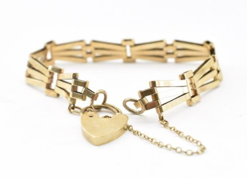 A hallmarked 9ct gold Art Deco style bracelet. The bracelet having geometric sunburst links united by heart lock fastener with safety chain. Hallmarked London 1997. Sponsor ALD. Weight 11.5g. Measures approx 17cms.