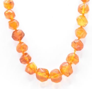 A graduating amber bead necklace. The beads threaded on a knotted string with a concealed hook clasp. Measures 22 inches. Weight 44.8g.