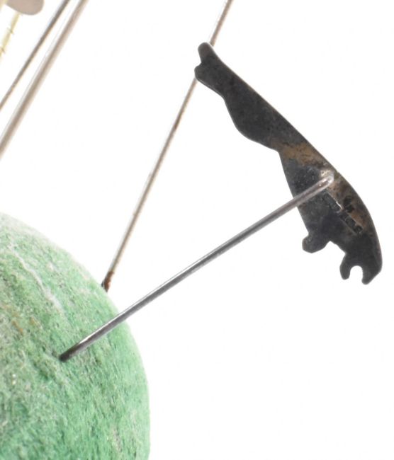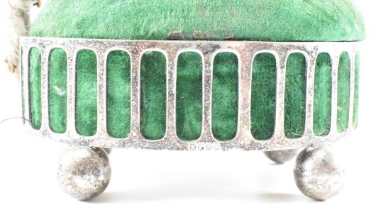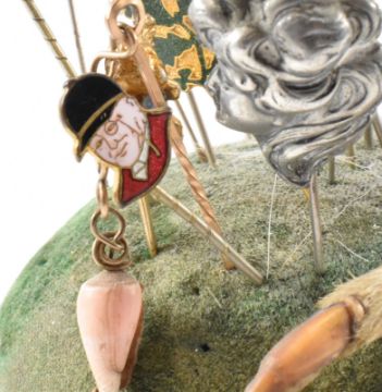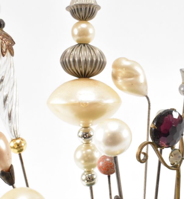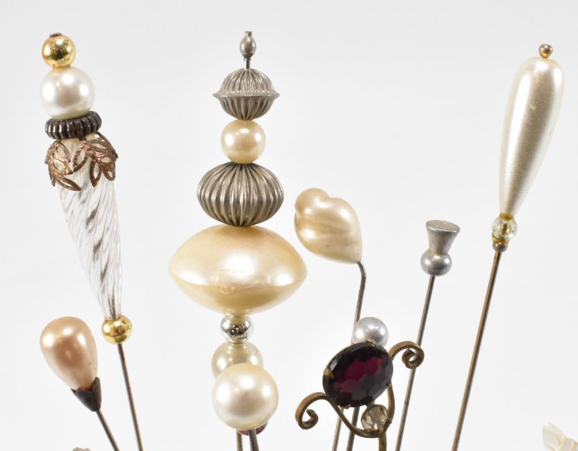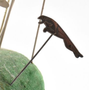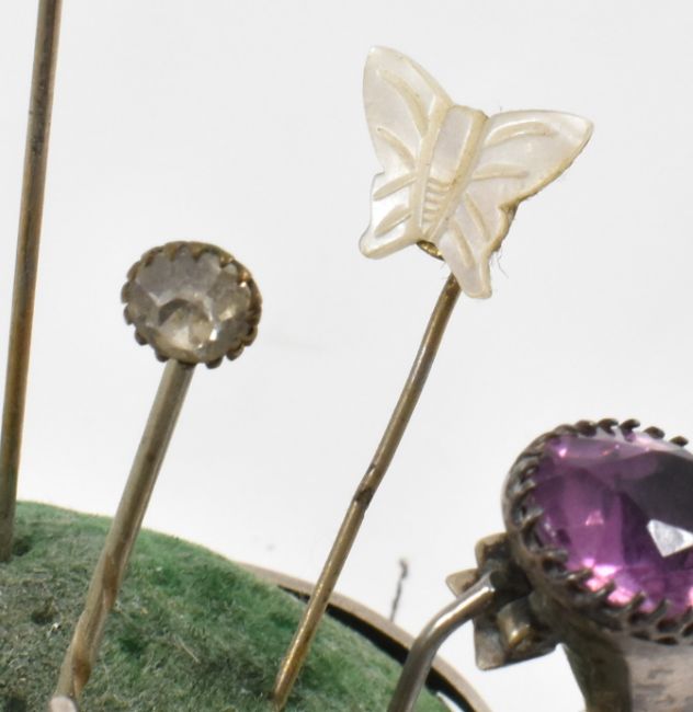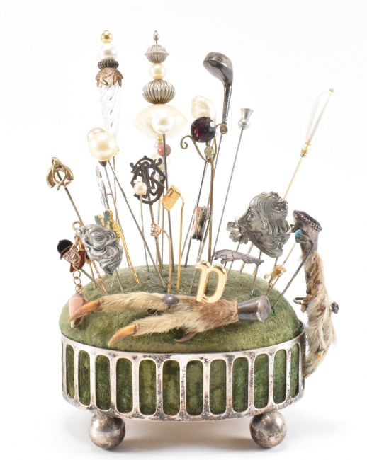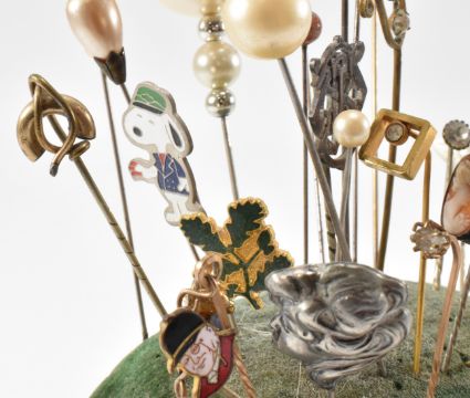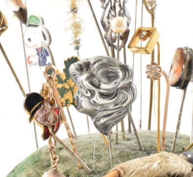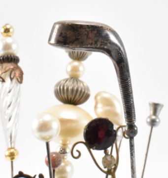 A large selection of silver and metal stick pins. The pins to include pearl simulants, Art Nouveau style pewter pins, snoopy a hallmarked silver golf club,hallmarked silver jaguar, to include two lucky rabbits feet  including a large EPNS pin cushion box opening to reveal a lined interior. Measurement guide golf club pin approx 12cm,