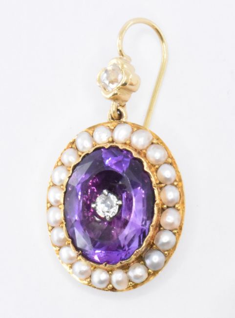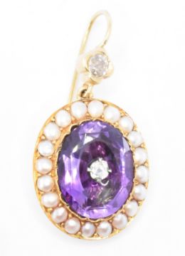 A 19th Century Victorian gold, amethyst and diamond jewellery suite. The suite consisting of drop earrings with a matching pendant necklace. The pendant having an oval cut amethyst with a halo of half pearls, a pear drop cut amethyst suspended below and four round old cut diamonds and one oval cut diamond to the centre. The earrings having hook fastenings, with a halo of half pearls surrounding each amethyst and two old cut diamonds set to each. Unmarked. Principle amethyst measures 2 x 1.6cm. Pendant measures 6.5cm. Earrings measure 3.2cm. Weight 29.0g.