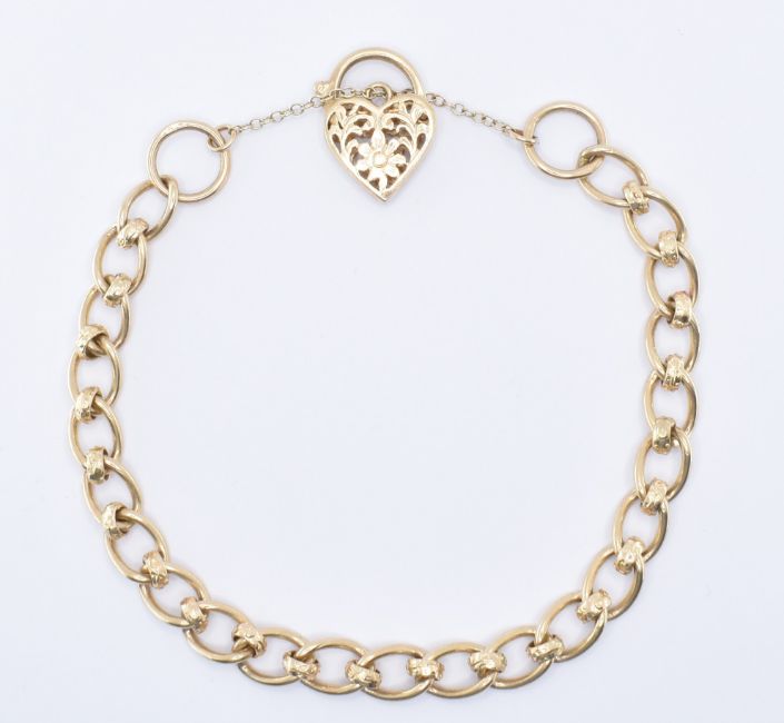 A  9ct gold and diamond bracelet. The bracelet formed of fancy links united by diamond set heart lock and safety chain. Marked 375, tests indicate 9ct gold. Weight 18.6g. Measures approx 19cm.