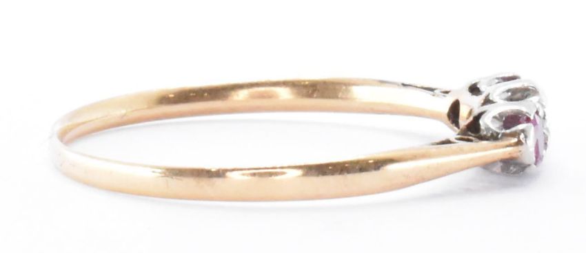 A 14ct gold diamond and ruby three stone ring. The ring having a central round cut diamond flanked by two round cut rubies. Tests indicate 14ct. Principle stone measures approximately 0.155ct. Ring size R. Total weight 1.4g.