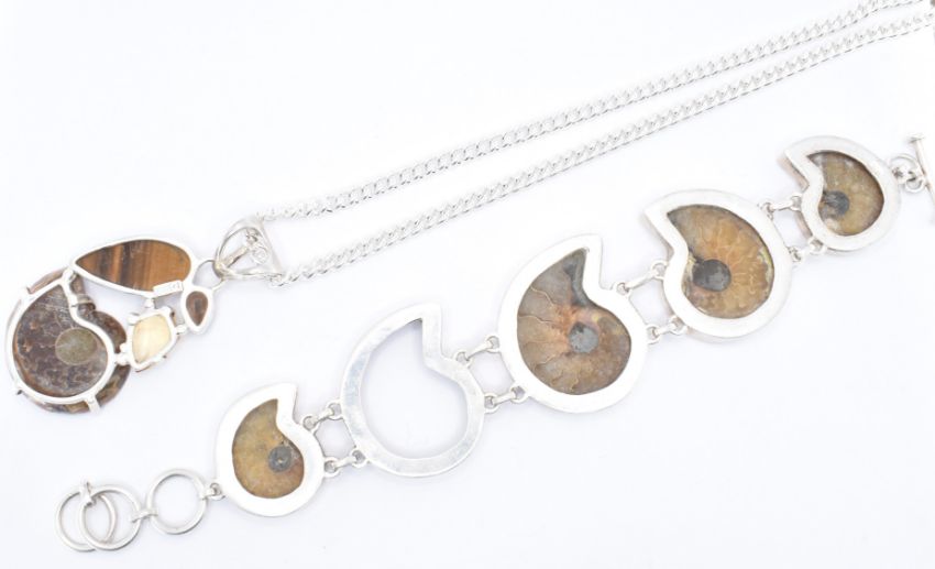 A 925 silver and fossil ammonite bracelet and pendant necklace. The necklace strung with a citrine quartz and tigers eye with ammonite upon a silver hallmarked chain together with a hallmarked bracelet (af one ammonite missing). Measures chain 90cm, pendant 5.8cm, bracelet 21.5cm. Weight 133g.