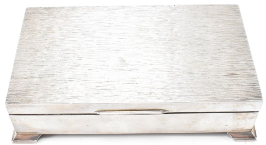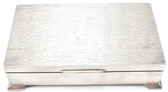 A silver hallmarked desk top cigarette box. The box of rectangular form having a bark effect lid with bracket feet. Hallmarked Birmingham 1974, makers marks for makers marks for Harman Brothers. Measures 15 x 9 x 3.5cm. Weight 452g. Wooden lined.