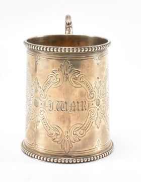 A 19th Century Victorian silver hallmarked christening cup. The cup of cylindrical form with beaded borders, engraved details and a scrolled handle. Hallmarked London 1866, makers marks for Richards & Brown. Weight 104.6g. Measures 9cm tall.
